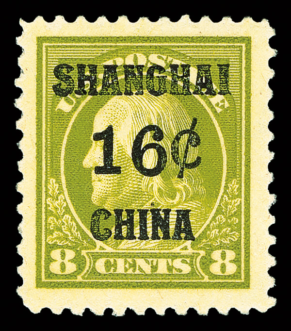 5399 nh K8 imageOffices in China, 1919, 16¢ on 8¢ olive bister (Scott K8), Wonderfully rich tone with massive margins all around, o.g., never hinged; gum skip at bottom, Extremely Fine.