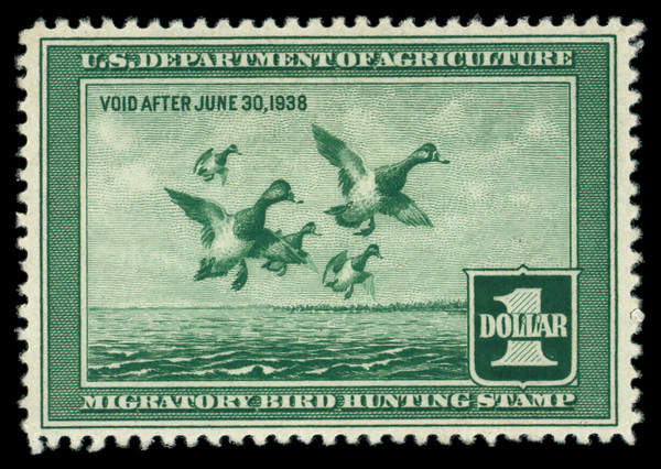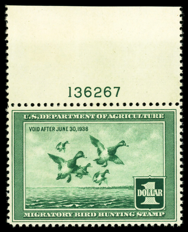 5487 nh RW4 imageFederal Duck Stamp, 1937, $1 Scaup Ducks (Scott RW4), plate number single, o.g., never hinged (gum bends), Very Fine.