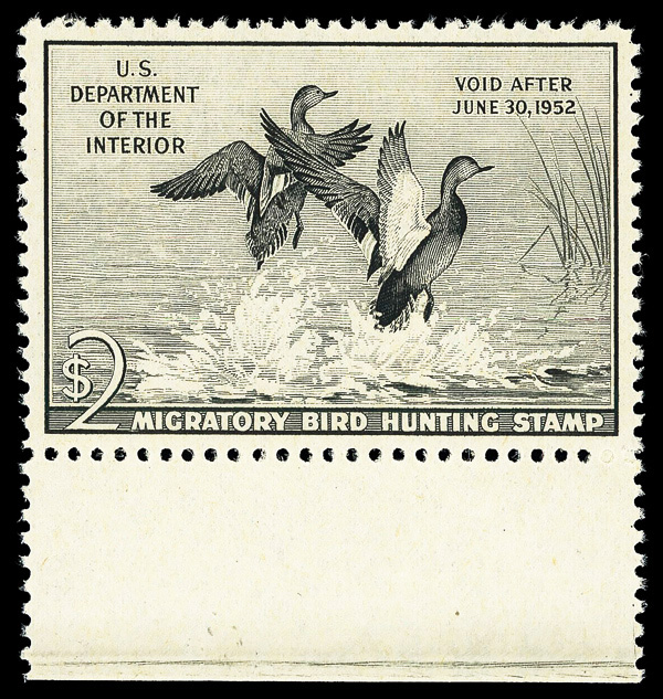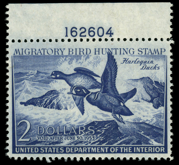5504 nh RW19 imageFederal Duck Stamp, 1952, $2 Harlequin Ducks (Scott RW19), plate number single, o.g., never hinged, Very Fine to Extremely Fine.