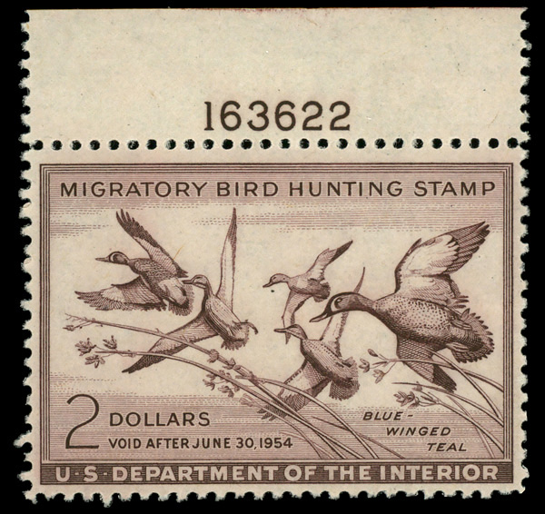 5505 nh RW20 imageFederal Duck Stamp, 1953, $2 Blue-winged Teals (Scott RW20), plate number single, o.g., never hinged (noticeable gum skips), Very Fine.