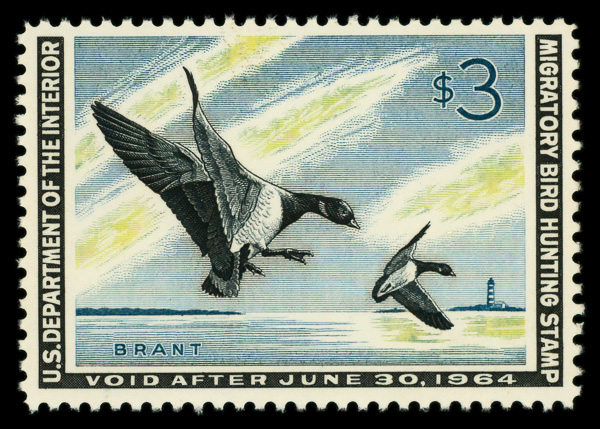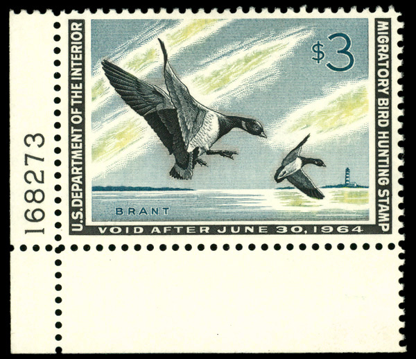 5516 og RW30 imageFederal Duck Stamp, 1963, $3 Brants (Scott RW30), plate number single, o.g., lightly hinged, Very Fine.