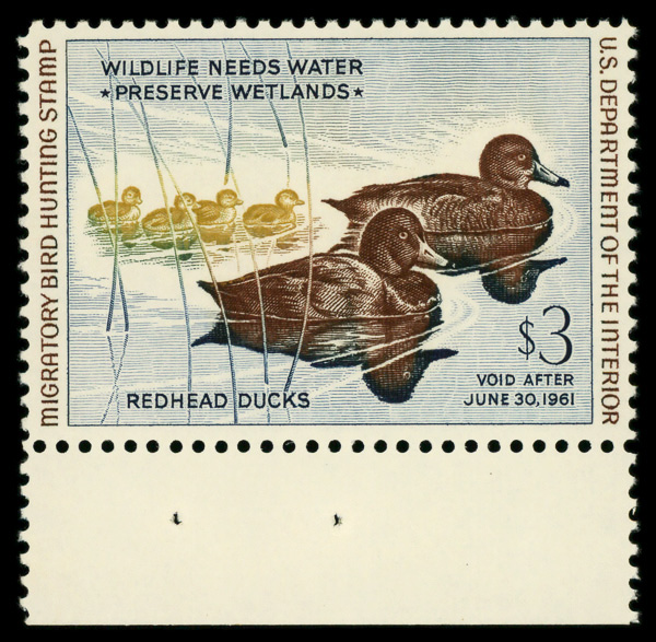 5512 nh RW27 imageFederal Duck Stamp, 1960, $3 Redhead Ducks (Scott RW27), o.g., never hinged, Extremely Fine.