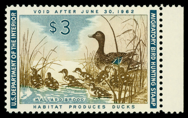 5513 nh RW28 imageFederal Duck Stamp, 1961, $3 Mallards (Scott RW28), o.g., never hinged, Extremely Fine.