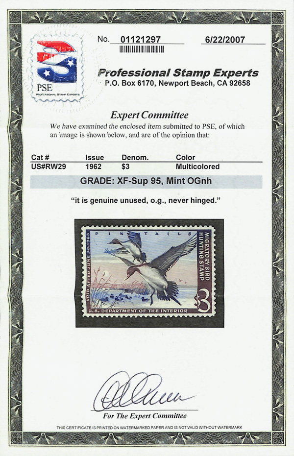 5514 nh RW29 imageFederal Duck Stamp, 1962, $3 Pintail Drakes (Scott RW29), o.g., never hinged, Extremely Fine to Superb, with 2007 P.S.E. certificate graded XF-SUP 95.