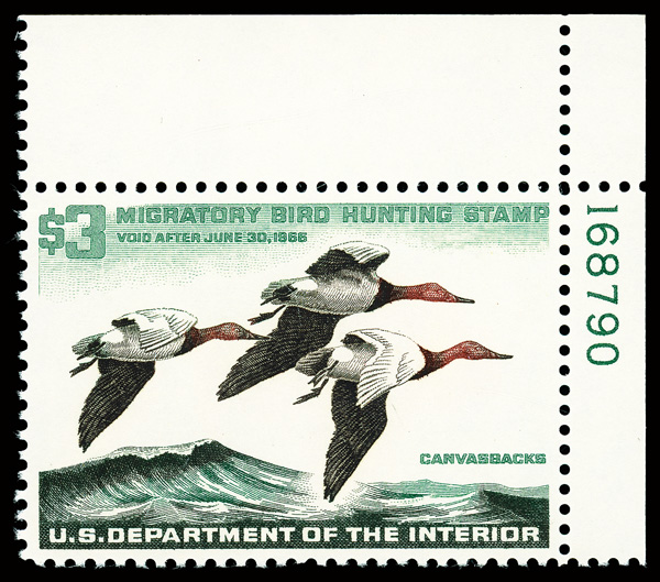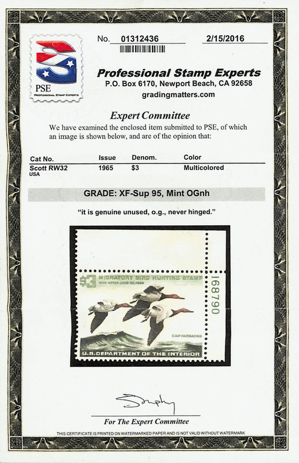 5518 nh RW32 imageFederal Duck Stamp, 1965, $3 Canvasback Drakes (Scott RW32), plate number single, o.g., never hinged, Extremely Fine to Superb, with 2016 P.S.E. certificate graded XF-SUP 95.