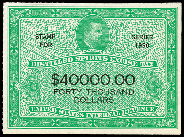 5483 ng RX24 imageDistilled Spirits Excise Tax, 1950, $40,000 yellow green & black (Scott RX24), Post-office fresh quality, without gum as issued, Very Fine.