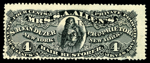 5481 O RS249d imageVan Duzer, S.R., 4¢ black, watermarked USIR (Scott RS249d), Scarce paper of this difficult Medicine stamp; small thins and short perf at bottom, Fine.