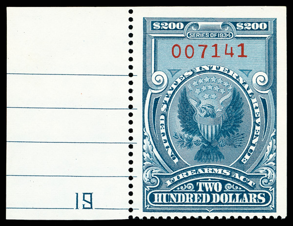 5484 ng RY6 imageFirearms Transfer Tax, 1974, $200 dull blue & red, type II (Scott RY6), Fresh with full tab from booklet pane, without gum as issued, Very Fine.