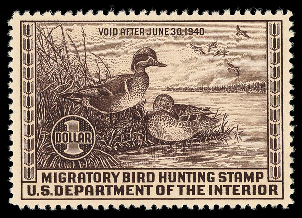 5490 nh RW7 imageFederal Duck Stamp, 1940, $1 Black Mallards (Scott RW7), o.g., never hinged, Very Fine to Extremely Fine.