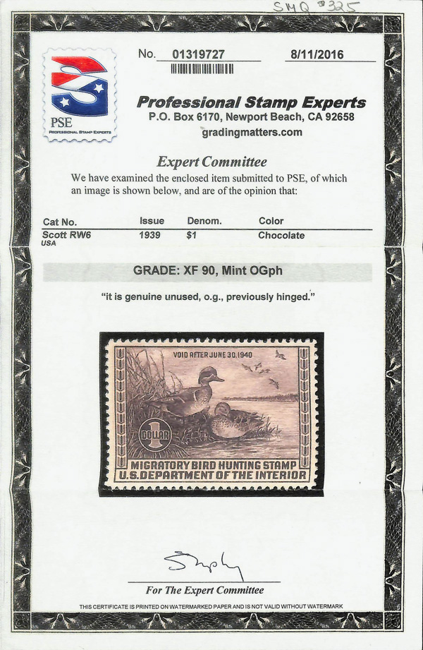 5489 nh RW6 imageFederal Duck Stamp, 1939, $1 Green-winged Teals (Scott RW6), o.g., never hinged, Extremely Fine, with 2016 P.S.E. certificate graded XF 90.