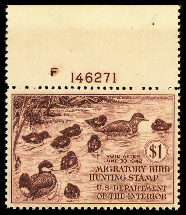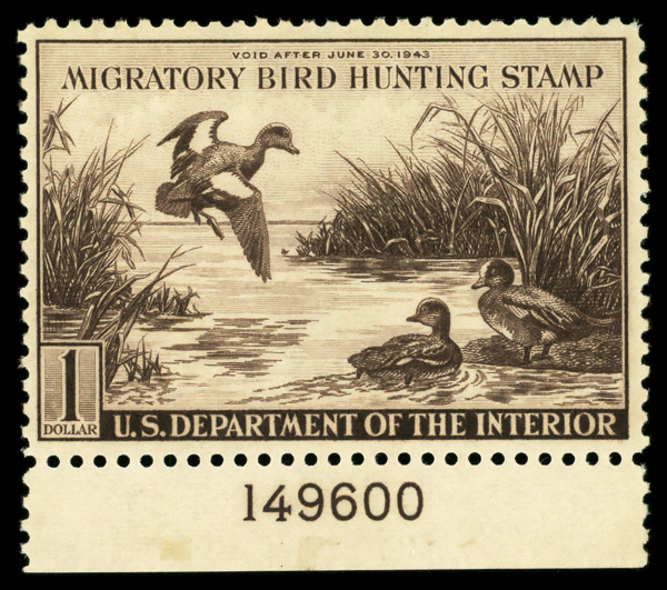 5493 nh RW9 imageFederal Duck Stamp, 1942, $1 Baldpates (Scott RW9), plate number single, o.g., never hinged, Very Fine.