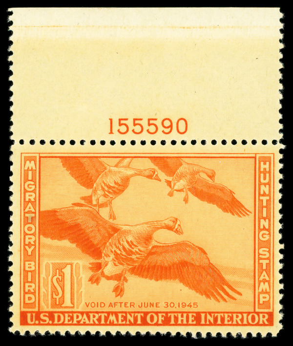 5495 nh RW11 imageFederal Duck Stamp, 1944, $1 White-fronted Geese (Scott RW11), plate number single, o.g., never hinged (paper inclusion), Very Fine to Extremely Fine.