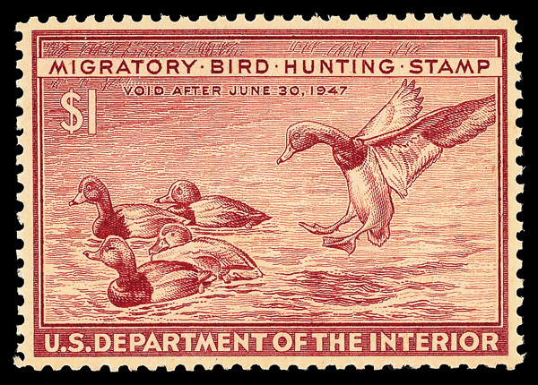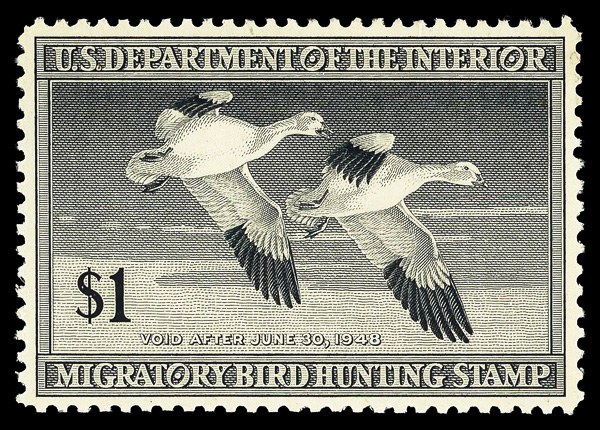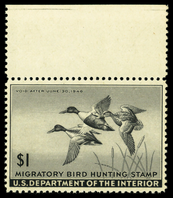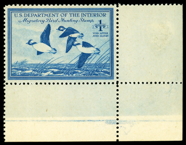5500 nh RW15 imageFederal Duck Stamp, 1948, $1 Buffleheads (Scott RW15), corner margin single, o.g., never hinged, Superb.