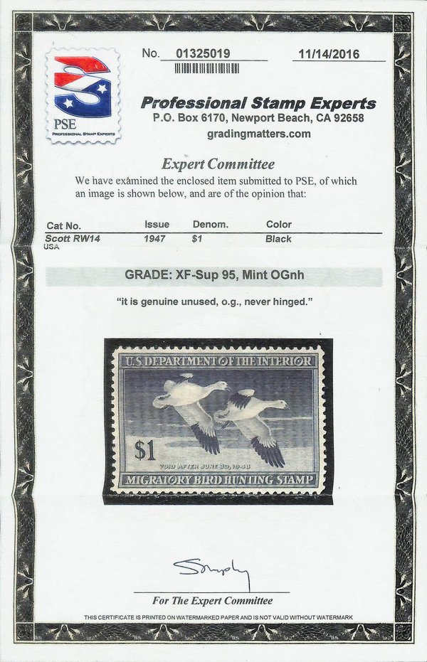 5499 nh RW14 imageFederal Duck Stamp, 1947, $1 Snow Geese (Scott RW14), o.g., never hinged, Extremely Fine to Superb, with 2016 P.S.E. certificate graded XF-SUP 95.
