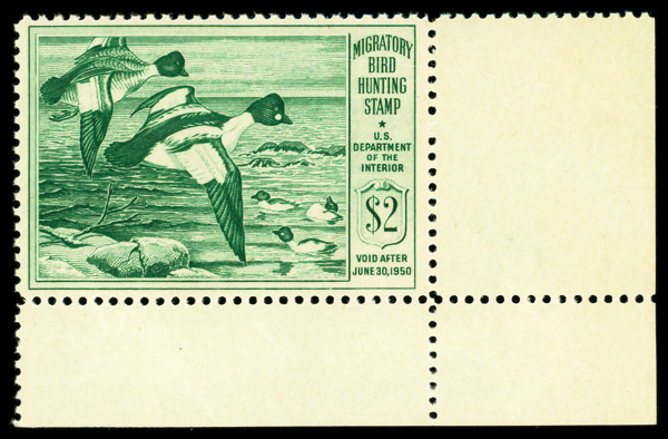 5501 nh RW16 imageFederal Duck Stamp, 1949, $2 Goldeneye Ducks (Scott RW16), corner margin single, o.g., never hinged (gum skips), Very Fine to Extremely Fine.