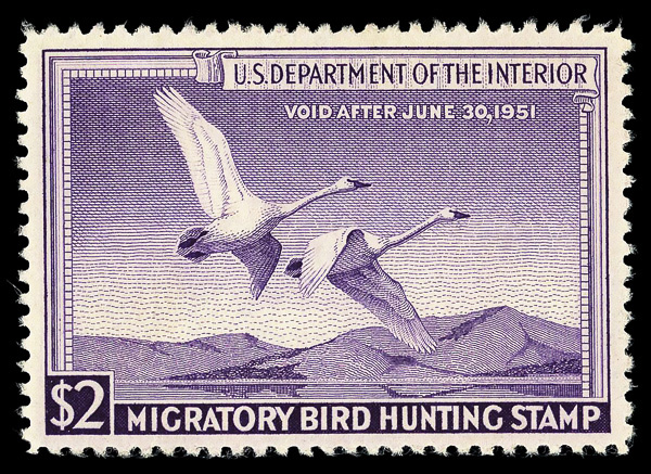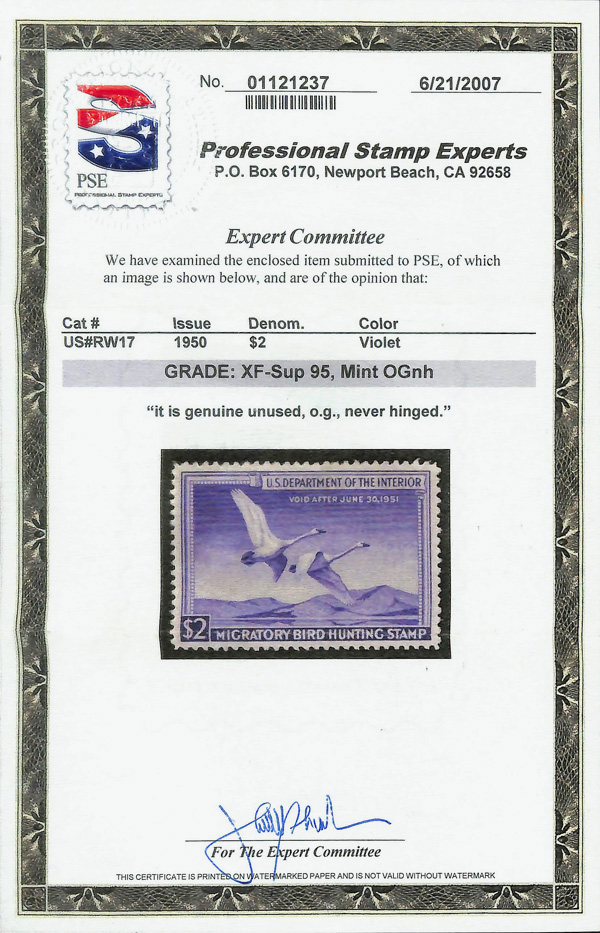 5502 nh RW17 imageFederal Duck Stamp, 1950, $2 Trumpeter Swans (Scott RW17), o.g., never hinged, Extremely Fine to Superb, with 2007 P.S.E. certificate graded XF-SUP 95.