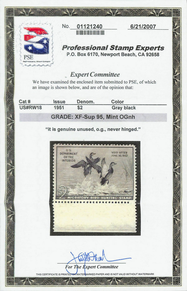 5503 nh RW18 imageFederal Duck Stamp, 1951, $2 Gadwall Ducks (Scott RW18), o.g., never hinged, Extremely Fine to Superb, with 2007 P.S.E. certificate graded XF-SUP 95.