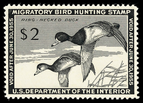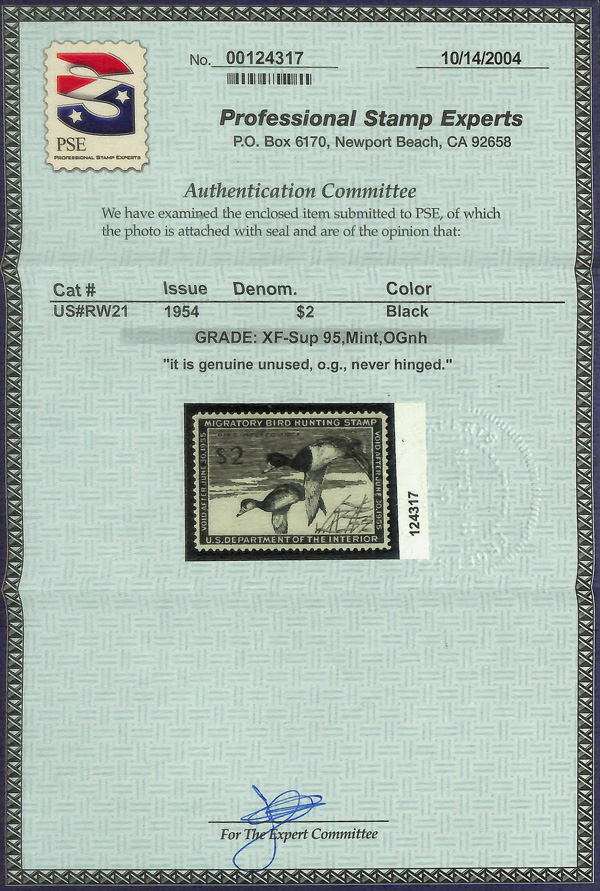 5506 nh RW21 imageFederal Duck Stamp, 1954, $2 Ring-necked Ducks (Scott RW21), o.g., never hinged, Extremely Fine to Superb, with 2004 P.S.E. certificate graded XF-SUP 95.