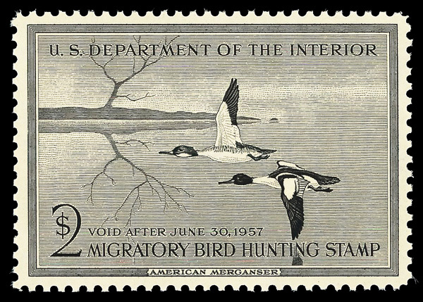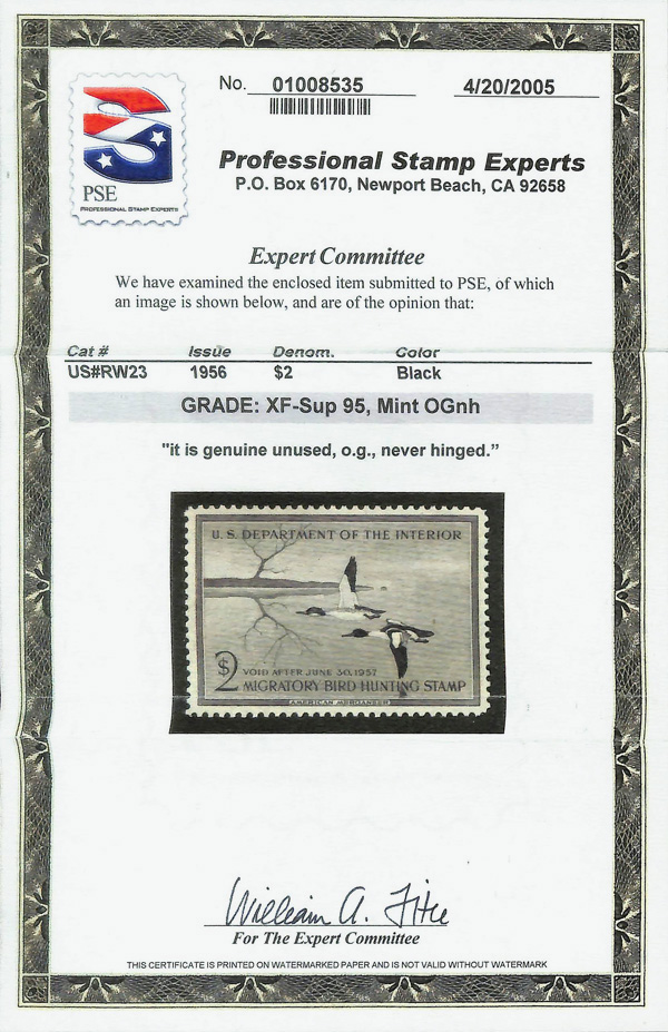 5508 nh RW23 imageFederal Duck Stamp, 1956, $2 American Merganser (Scott RW23), o.g., never hinged, Extremely Fine to Superb, with 2005 P.S.E. certificate graded XF-SUP 95.
