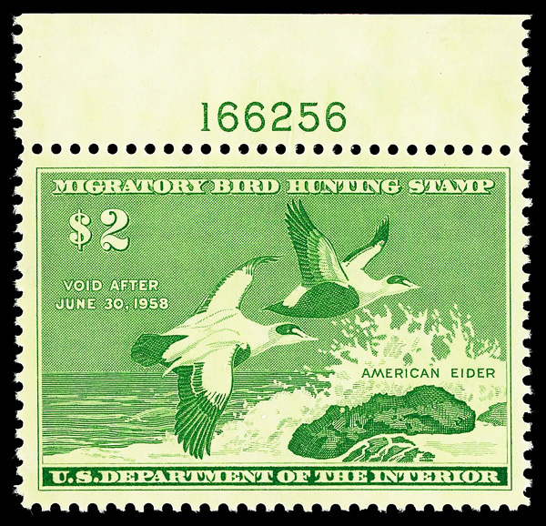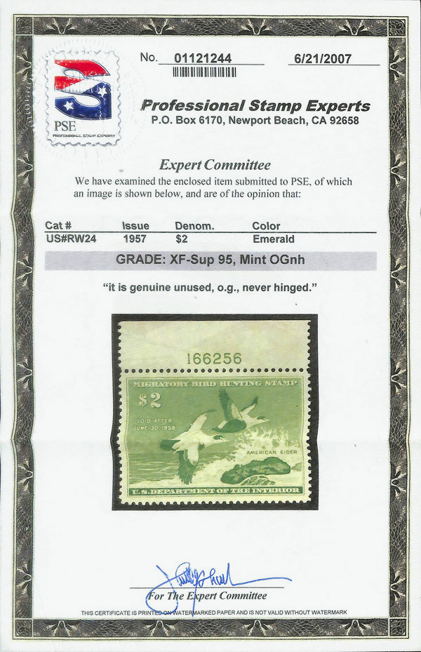 5509 nh RW24 imageFederal Duck Stamp, 1957, $2 American Eider (Scott RW24), plate number single, o.g., never hinged, Extremely Fine to Superb, with 2007 P.S.E. certificate graded XF-SUP 95.