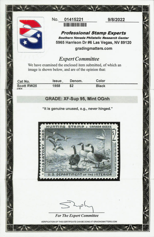 5510 nh RW25 imageFederal Duck Stamp, 1958, $2 Canada Geese (Scott RW25), o.g., never hinged, Extremely Fine to Superb, with 2022 P.S.E. certificate graded XF-SUP 95.