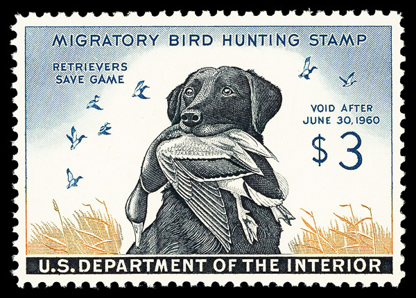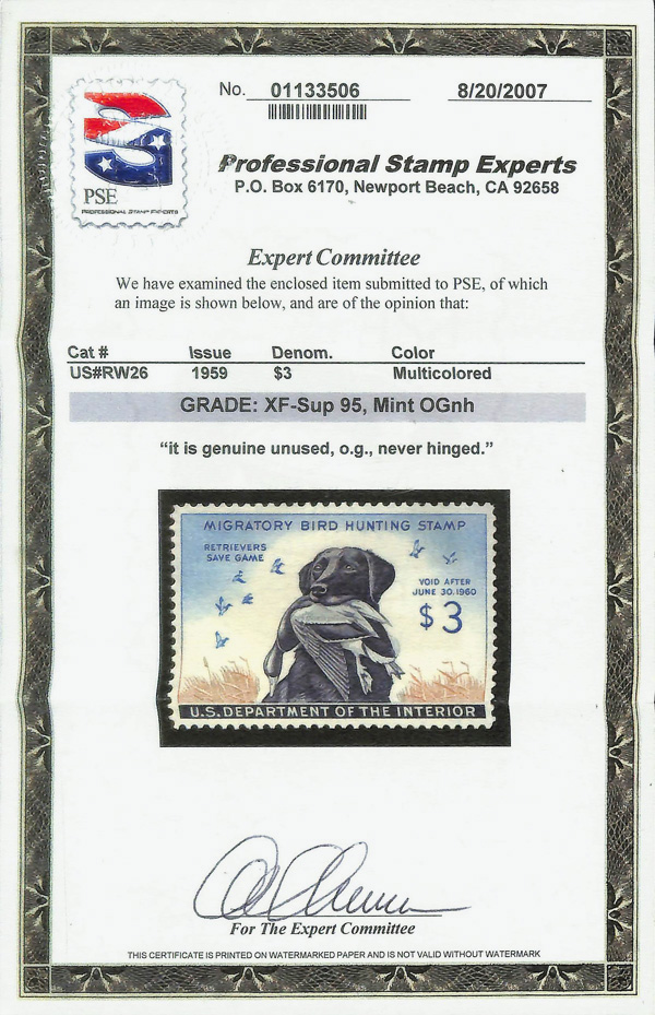 5511 nh RW26 imageFederal Duck Stamp, 1959, $3 Labrador Retriever (Scott RW26), o.g., never hinged, Extremely Fine to Superb, with 2007 P.S.E. certificate graded XF-SUP 95.