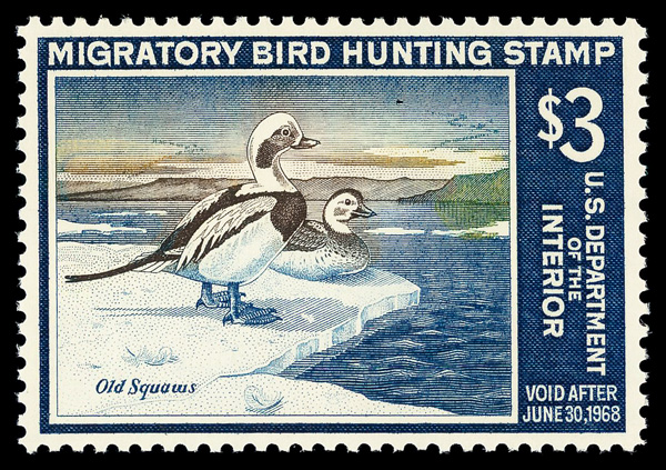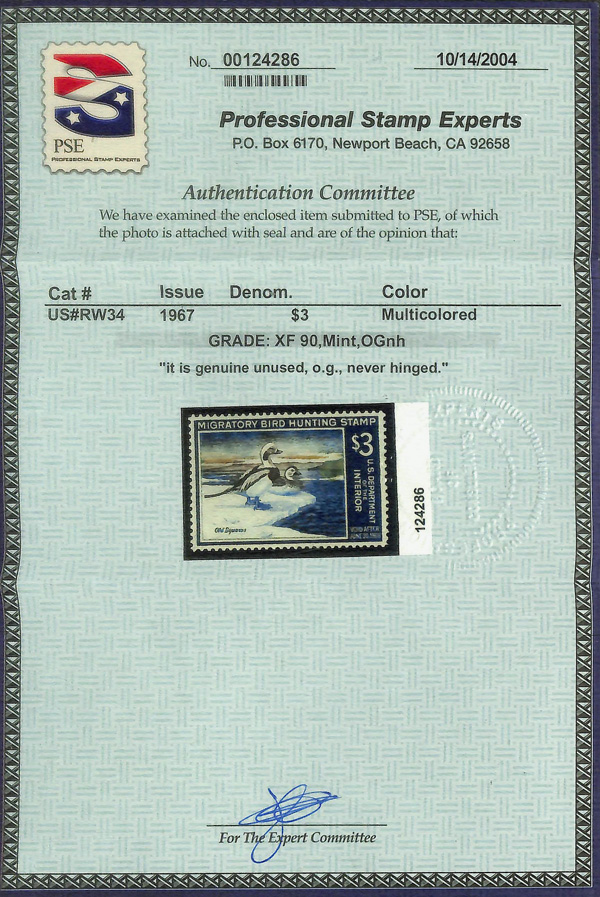 5520 nh RW34 imageFederal Duck Stamp, 1967, $3 Old Squaw Ducks (Scott RW34), o.g., never hinged, Extremely Fine, with 2004 P.S.E. certificate graded XF 90.