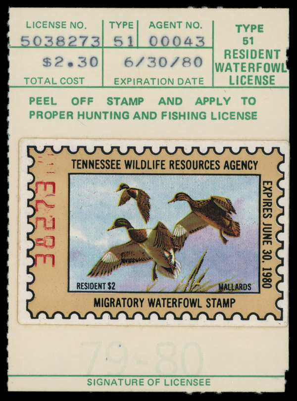 5557 nh TN1 imageTennessee 1979, $2 Resident Mallards, on card (Scott TN1), o.g., never hinged, Very Fine to Extremely Fine.