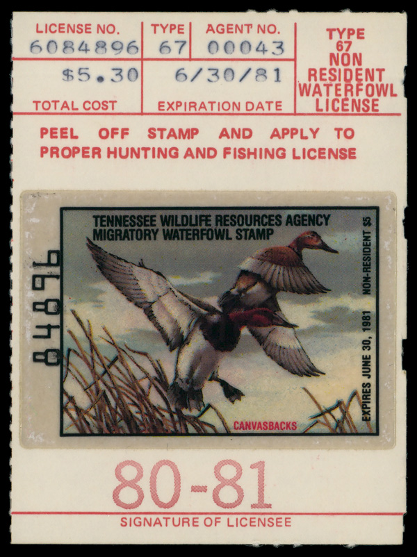 5558 nh TN4 imageTennessee 1980, $5 Non-Resident Canvasbacks, on card (Scott TN4), o.g., never hinged, Very Fine.