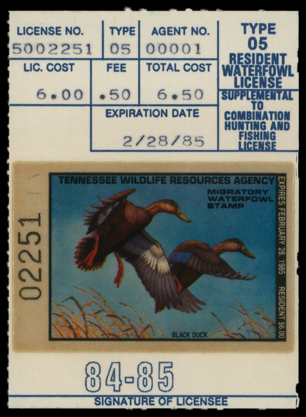 5559 nh TN8 imageTennessee 1984, $6 Black Ducks, on card (Scott TN8), o.g., never hinged, Very Fine to Extremely Fine.