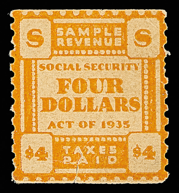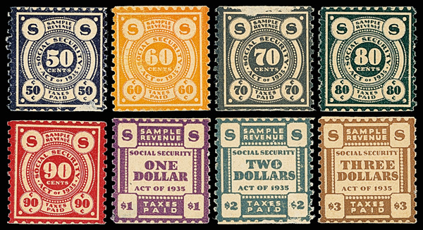 5560 E   image1935, Social Security "Taxes Paid" Coil Essays, nine different denominations from 50¢ to $4, with strong colors and bright paper; 50¢ & 70¢ scuffed; $1 adherence on gum, all others never hinged, Very Fine overall. (Image) (Image2) (All Images)