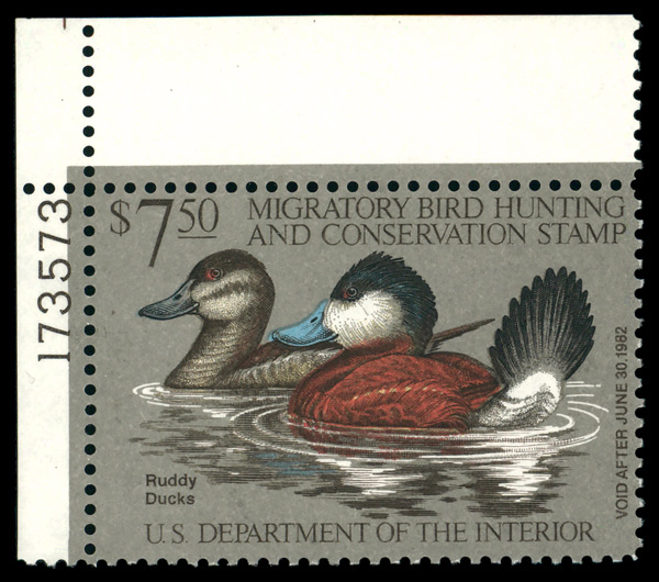 5526 nh RW48 imageFederal Duck Stamp, 1981, $7.50 Ruddy Ducks (Scott RW48), plate number single, o.g., never hinged, Very Fine.