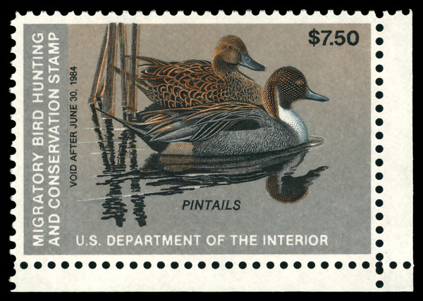 5528 nh RW50 imageFederal Duck Stamp, 1983, $7.50 Pintails (Scott RW50), o.g., never hinged, Very Fine to Extremely Fine.