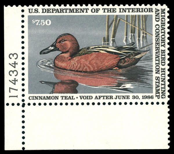 5529 nh RW52 imageFederal Duck Stamp, 1985, $7.50 Cinnamon Teal (Scott RW52), plate number single, o.g., never hinged, Very Fine.