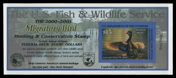 5544 nh RW67A imageFederal Duck Stamp, 2000, $15 Mottled Duck, self-adhesive (Scott RW67A), o.g., never hinged, Extremely Fine.