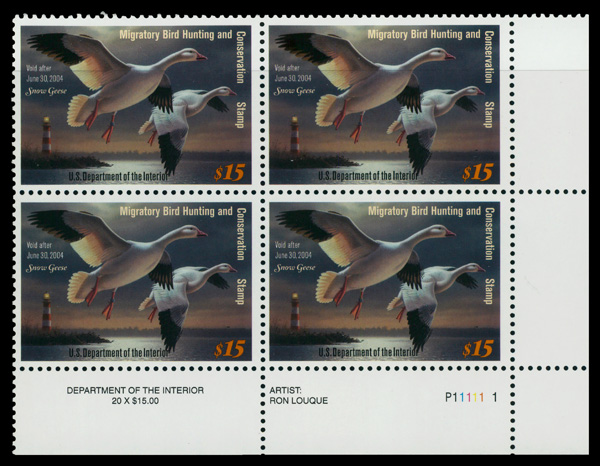 5547 nhbl RW70 imageFederal Duck Stamp, 2003, $15 Snow Geese (Scott RW70), plate block of 4, o.g., never hinged, Very Fine.