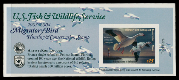 5548 nh RW70A imageFederal Duck Stamp, 2003, $15 Snow Geese, self-adhesive (Scott RW70A), o.g., never hinged, Extremely Fine.