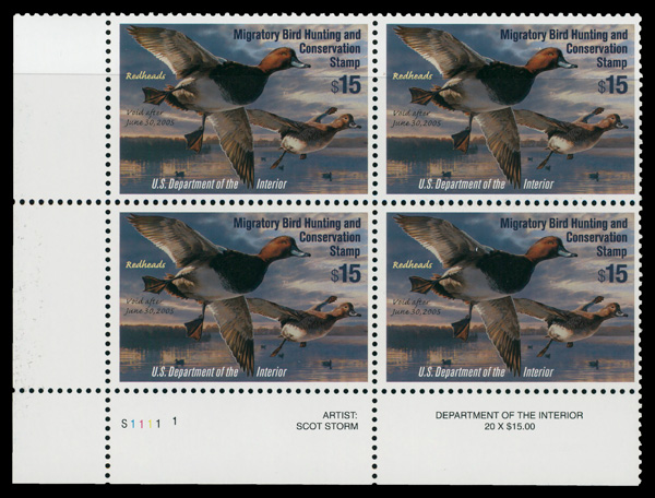 5549 nhbl RW71 imageFederal Duck Stamp, 2004, $15 Redheads (Scott RW71), plate block of 4, o.g., never hinged, Very Fine.