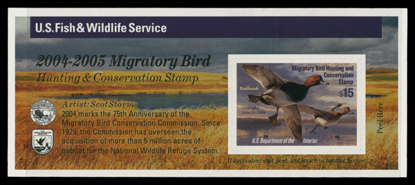 5550 nh RW71A imageFederal Duck Stamp, 2004, $15 Redheads, self-adhesive (Scott RW71A), o.g., never hinged, Extremely Fine.