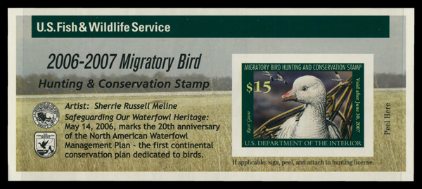 5551 nh RW73A imageFederal Duck Stamp, 2006, $15 Ross's Goose, self-adhesive (Scott RW73A), o.g., never hinged, Extremely Fine.