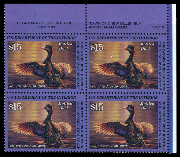5543 nhbl RW67 imageFederal Duck Stamp, 2000, $15 Mottled Duck (Scott RW67), plate block of 4, o.g., never hinged, Extremely Fine.