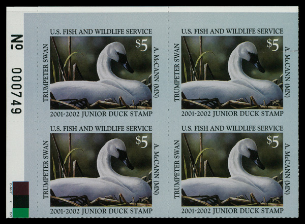 5556 nhbl JDS9 imageJunior Duck Stamp, 2001, $5 Trumpeter Swan (Scott JDS9), plate block of 4, o.g., never hinged, Extremely Fine.