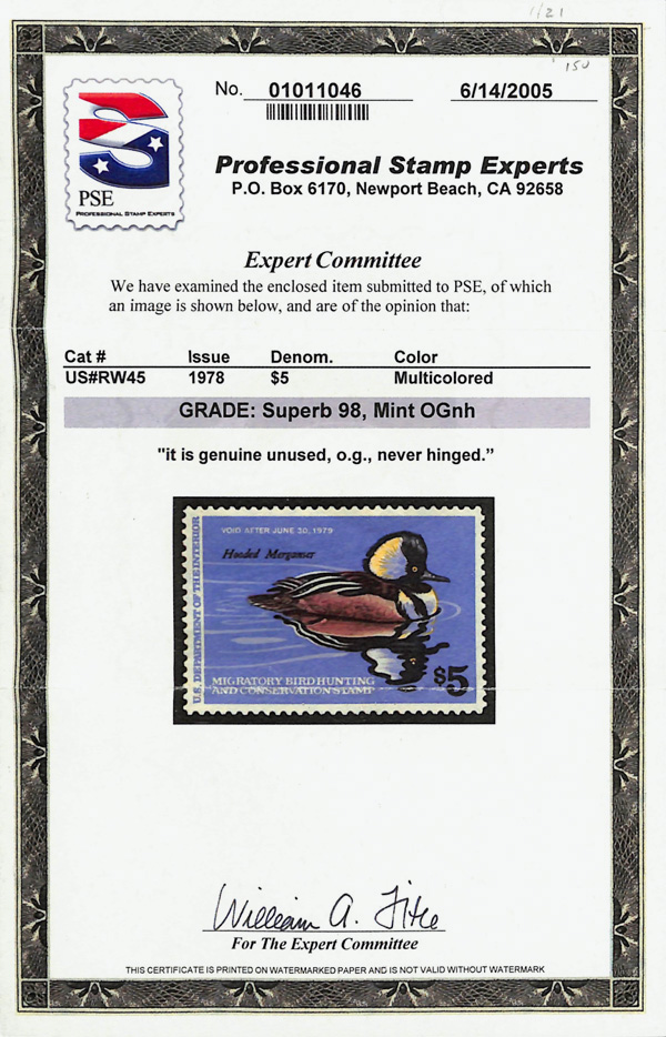 5525 nh RW45 imageFederal Duck Stamp, 1978, $5 Hooded Merganser (Scott RW45), o.g., never hinged, Superb, with 2005 P.S.E. certificate graded SUP 98.