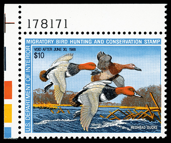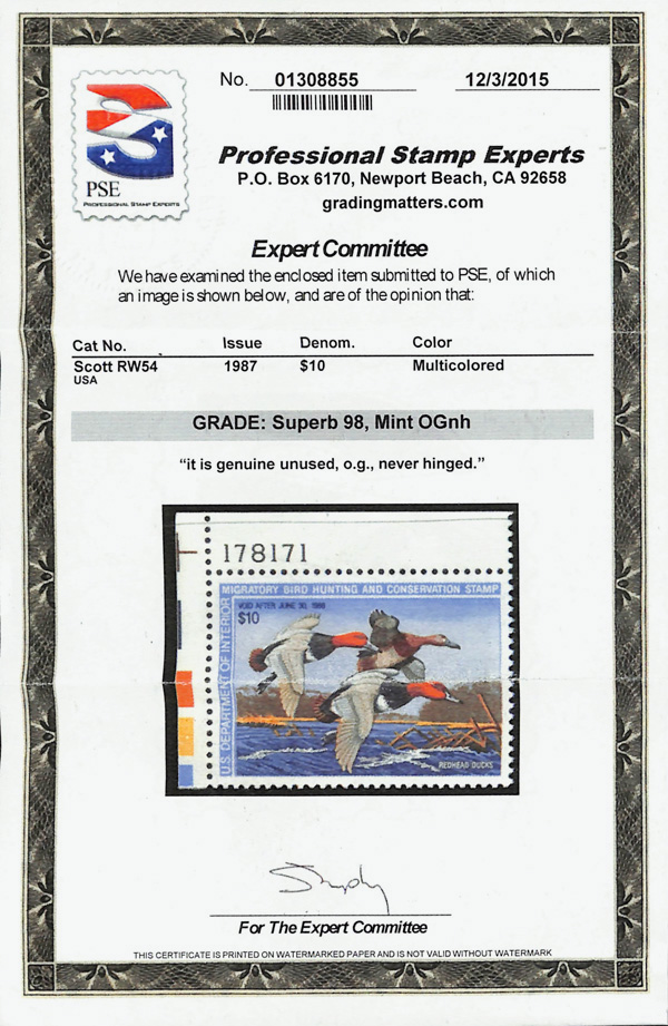 5532 nh RW54 imageFederal Duck Stamp, 1987, $10 Redhead Ducks (Scott RW54), plate number single, o.g., never hinged, Superb, with 2015 P.S.E. certificate graded SUP 98.