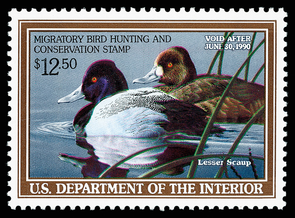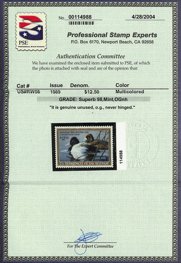 5534 nh RW56 imageFederal Duck Stamp, 1989, $12.50 Lesser Scaup (Scott RW56), o.g., never hinged, Superb, with 2004 P.S.E. certificate graded SUP 98.