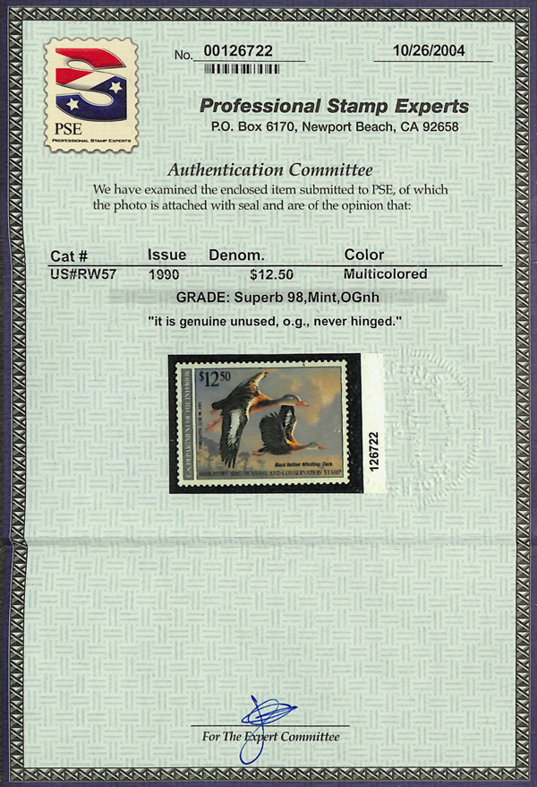 5535 nh RW57 imageFederal Duck Stamp, 1990, $12.50 Whistling Duck (Scott RW57), o.g., never hinged, Superb, with 2004 P.S.E. certificate graded SUP 98.