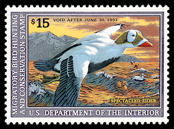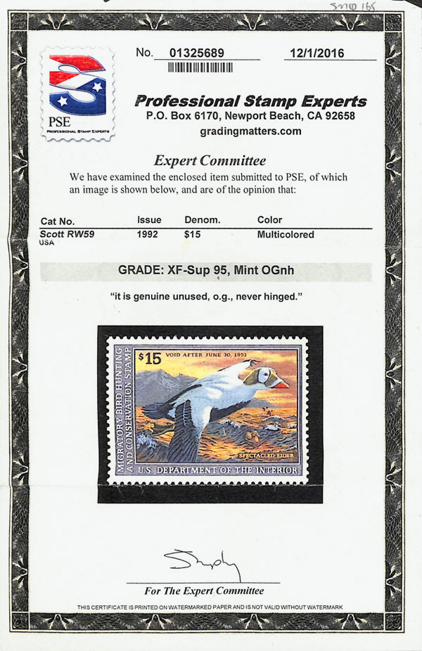 5537 nh RW59 imageFederal Duck Stamp, 1992, $15 Spectacled Eider (Scott RW59), o.g., never hinged, Extremely Fine to Superb, with 2016 P.S.E. certificate graded XF-SUP 95.