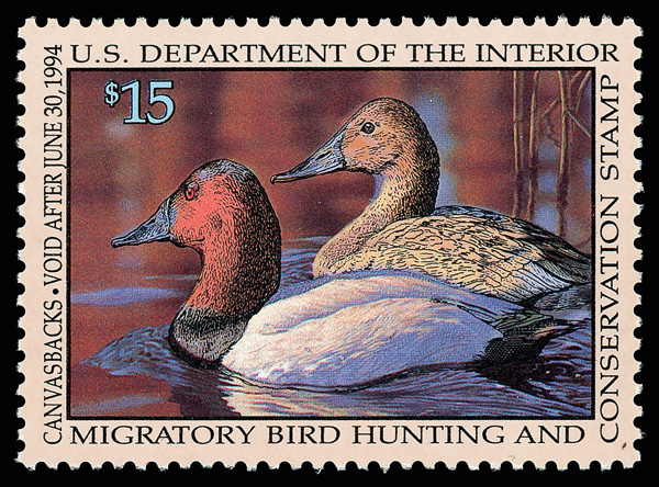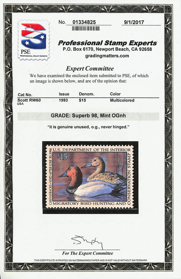 5538 nh RW60 imageFederal Duck Stamp, 1993, $15 Canvasbacks (Scott RW60), o.g., never hinged, Extremely Fine to Superb, with 2017 P.S.E. certificate graded SUP 98.