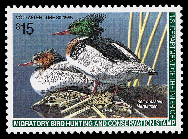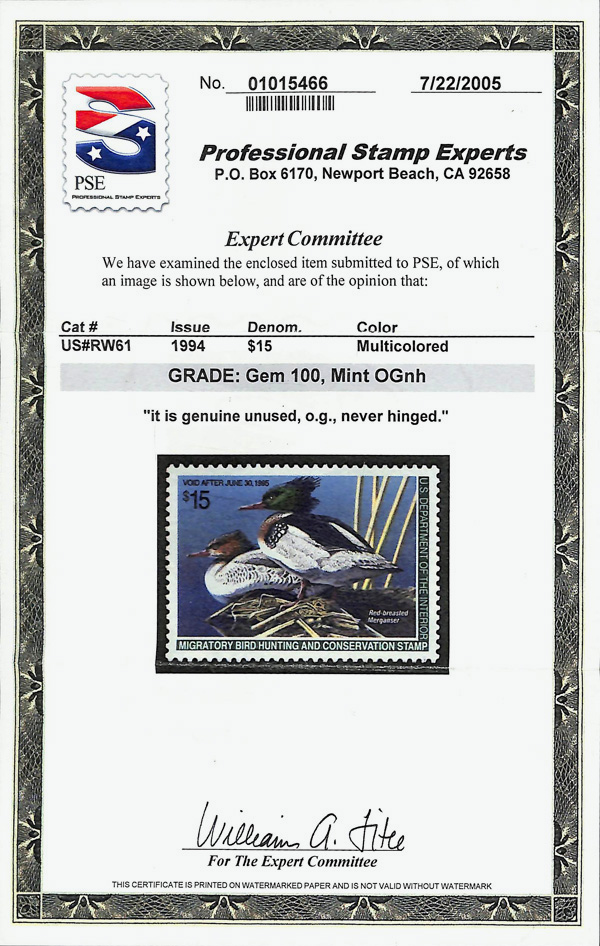 5539 nh RW61 imageFederal Duck Stamp, 1994, $15 Mergansers (Scott RW61), o.g., never hinged, Superb, with 2005 P.S.E. certificate graded GEM 100.