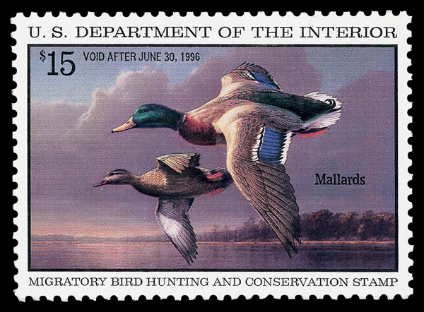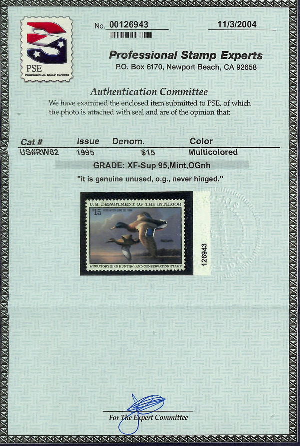 5540 nh RW62 imageFederal Duck Stamp, 1995, $15 Mallards (Scott RW62), o.g., never hinged, Extremely Fine to Superb, with 2004 P.S.E. certificate graded XF-SUP 95.